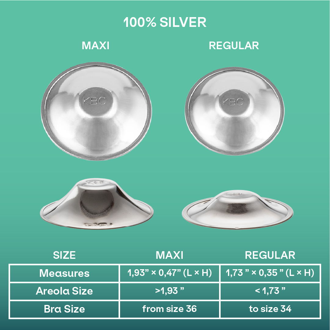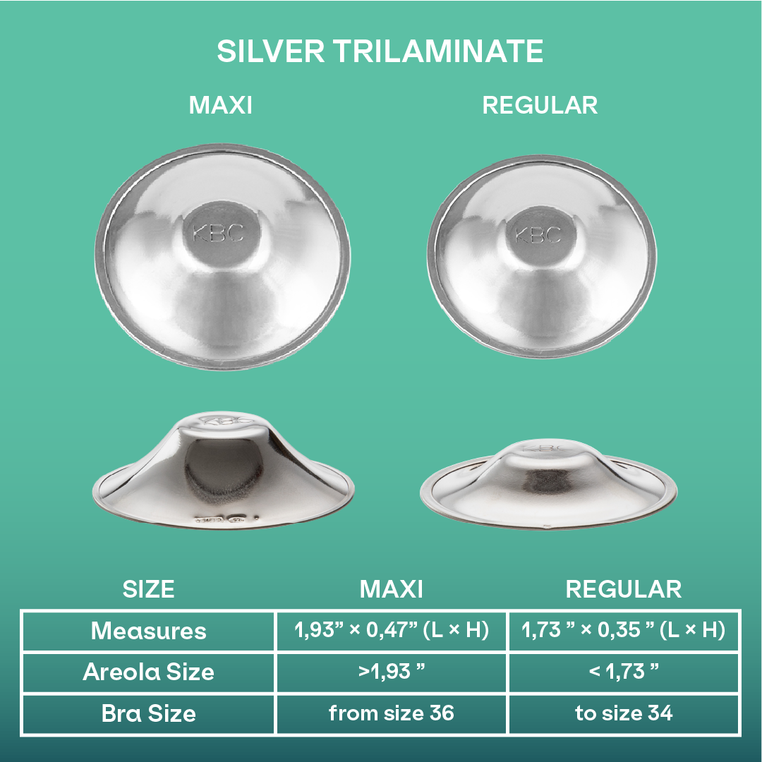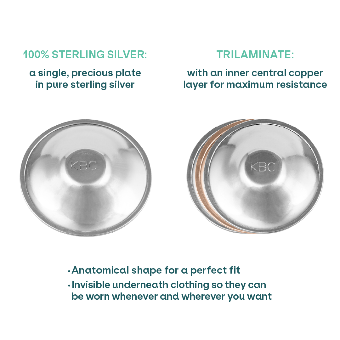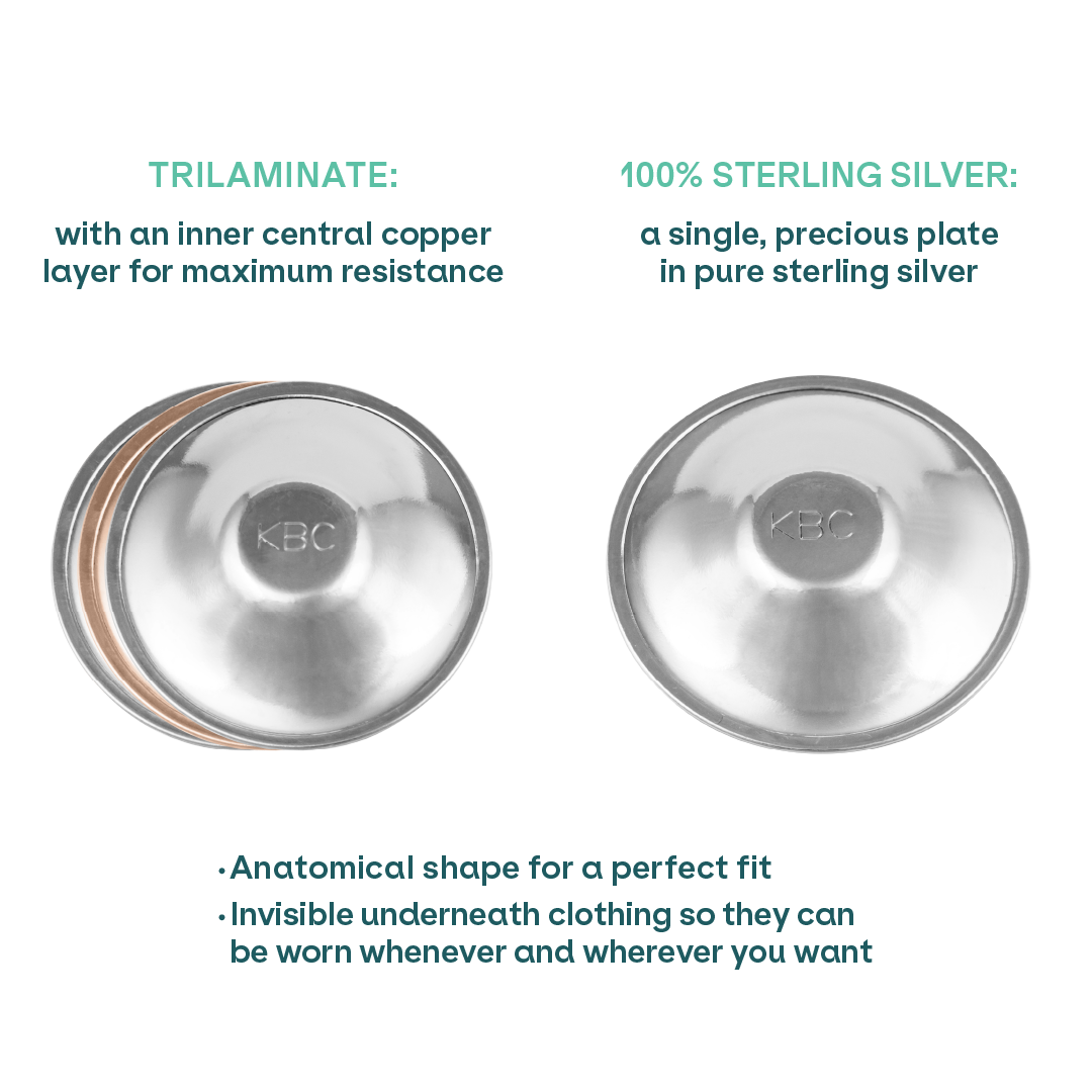 Available in two versions (100% sterling silver and Trilaminate silver), they are anatomically shaped, discreet underneath clothing and specially moulded to fit each and every breast shape, thanks to the two different sizes available (Regular and Maxi).